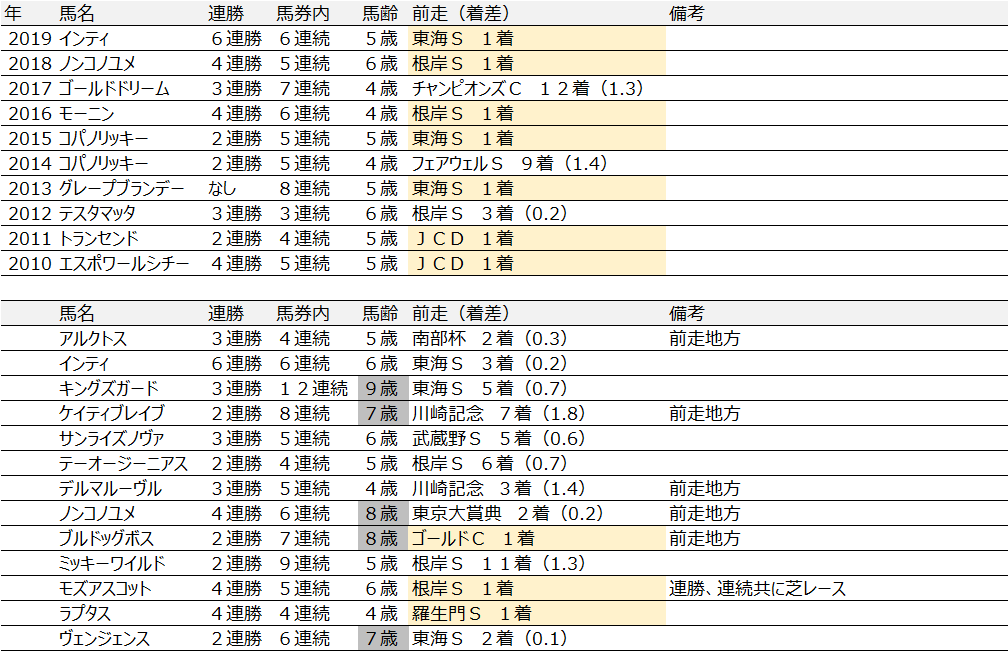 過去10年の勝ち馬の馬柱を見たところ、